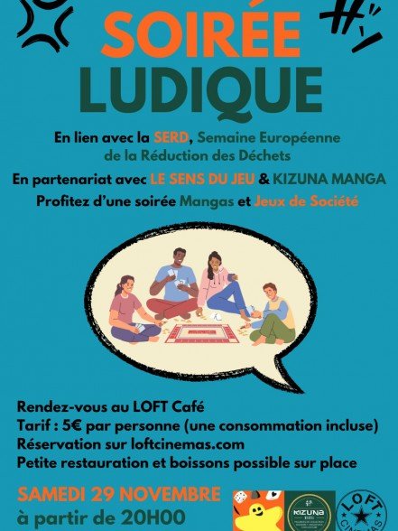 Soirée Ludique organisée ne partenariat avec LE SENS DU JEU et KIZUNA MANGA. Profitez d'un moment convivial au LOFT Café autour du jeu de société et du Manga. Vous pourrez tester les jeux de société proposé ar LE SENS DU JEU et profiter des conseils avisés de KIZUNA MANGA A partir de 20h et jusqu'à 23h au LOFT Café dans le hall du LOFT Cinémas Tarif d'entrée : 5€ (une consommation au café incluse) Possibilité de petite restauration sur place