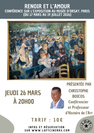 Renoir et l’amour Conférence sur l'exposition au musée d’Orsay, Paris (du 17 mars au 19 juillet 2026) Avec Christophe Boïcos À l’occasion des cent cinquante ans du Bal du moulin de la Galette (1876), chef-d’œuvre des collections du musée d’Orsay, cette exposition réunit pour la première fois un corpus majeur des scènes de la vie moderne réalisés par Renoir au cours des vingt premières années de sa carrière (1865-1885). Durant cette période, il participe à l’invention collective d’une « Nouvelle peinture » aux côtés de Manet, Monet, Morisot, Degas ou Caillebotte. Il se distingue toutefois par son sens singulier de l’empathie et sa capacité d’émerveillement, ne choisissant que des sujets heureux et en mettant toujours en valeur ses modèles. L’exposition met en évidence la prédilection de Renoir pour la représentation du jeune couple. Admirateur des peintres français du XVIIIe siècle (Watteau, Boucher, Fragonard), Renoir fait renaître une atmosphère de « fêtes galantes » et promeut une forme de liberté de mœurs et d’égalité entre les sexes dans le Paris de la fin du Second Empire et des débuts de la IIIe République. Pour la première fois depuis 1985 – date de la dernière rétrospective Renoir organisée à Paris – une exposition rassemble un ensemble significatif d’œuvres de la première partie de la carrière de l’artiste, parmi lesquelles ses plus grands chefs-d’œuvre : de La Grenouillère (1869, Stockholm, Nationalmuseum) aux Parapluies (1881-1885, Londres, The National Gallery), en passant par La Promenade (1870, Los Angeles, The J. Paul Getty Museum), la Danse à Bouvigal (1883, Boston, Museum of Fine Arts) et Le Déjeuner des canotiers (1880- 1881) très exceptionnellement prêté par la Phillips Collection de Washington.